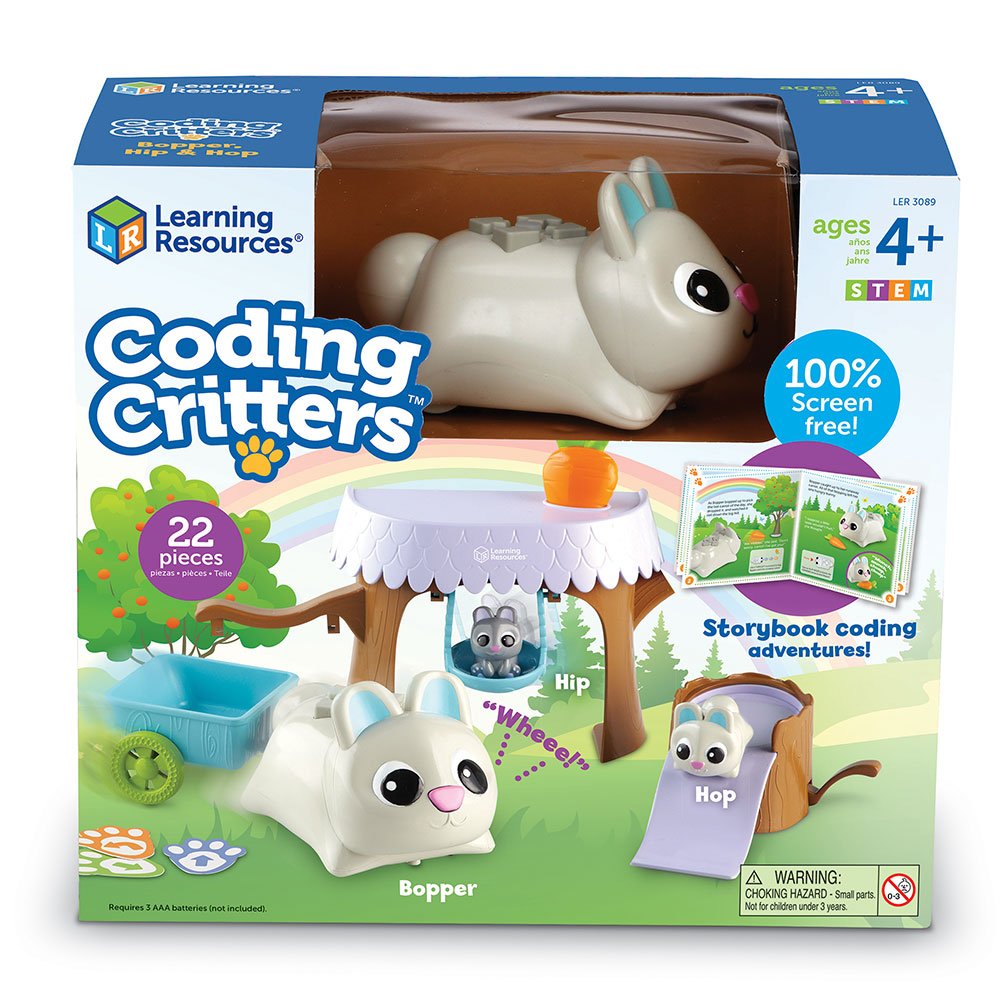 Coding Critters Bopper, Hip Hop ชุดเรียนรู้โคดดิ้งไปกับเพื่อน ๆ กระต่ายน้อย พบกับเพื่อนโค้ดดิ้งตัวแรกของเด็ก เเละเรียนรู้เกี่ยวกับหลักการ STEM พื้นฐานของเด็กในวัยก่อนเข้าเรียนผ่านเจ้ากระต่ายน้อยขี้เล่นโดย ไม่ต้องใช้หน้าจอคอมพิวเตอร์เลย เด็กๆจะหัดโค้ดดิ้งไปพร้อมกับการผจญภัย ของเพื่อนใหม่ในหนังสือนิทาน โดยนิทานแต่ละเรื่องจะท้าทายให้เด็กได้ค้นหา จากการละเล่นของเหล่ากระต่ายคริตเตอร์ อย่างเช่น เด็กจะโค้ดดิ้งให้บ๊อปเปอร์คว้าแครอท, ลากฮิปในรถเข็น หรือผลักชิงช้าให้ฮ๊อปได้หรือไม่ ? นอกจากนี้ เด็กๆ ยังจะสามารถต่อยอดการเรียนโค้ดดิ้งได้เองจากการออกแบบการเล่นของสัตว์ตัวน้อย เจ้าโค้ดดิ้งกระต่ายน้อยยังเป็นเพื่อนเล่นกับเด็กได้อย่างดีทีเดียว เช่น บ๊อปเปอร์ จะเริ่มเข้าโหมดเล่นเมื่อเด็กบีบจมูกมัน เด็กก็จะสามารถเลี้ยง ลูบ และดูแลเจ้าต่ายน้อยเพื่อนใหม่ อีกทั้งเจ้ากระต่ายน้อยยังสามารถร้องเพลงและเต้นสนุกสนานได้ประกอบด้วยอุปกรณ์ 22 ชิ้น และหนังสือนิทานประกอบการทํากิจกรรมโค้ดดิ้งที่ท้าทาย เหมาะสําหรับเด็กอายุ 4 ปี+